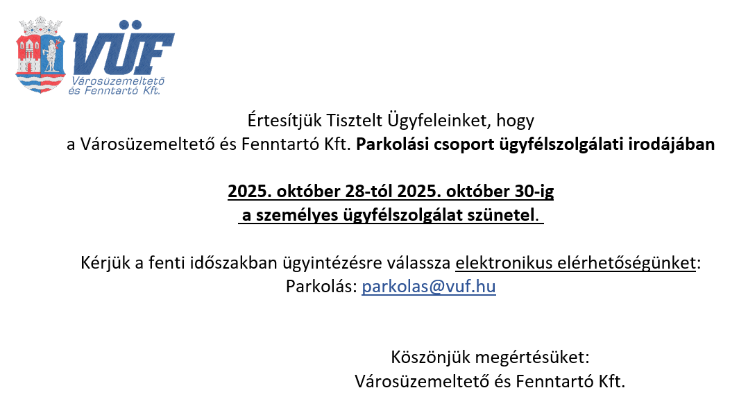 VÜF Parkolás Személyes ügyfélszolgálat szünetel a Parkolási csoportnál 2025-10-28 Tovább Távhő Üzemszünet a távhő szolgáltatásban 2025-10-17 Tovább VÜF Hírek Munkarend áthelyezett munkanapon 2025-10-14 Tovább Távhő Távhő szolgáltatás szünetel 2025-10-13 Tovább VÜF Parkgondozás Hamarosan indul az őszi városi fásítás 2025-10-13 Tovább Bővebben a Mosonmagyaróvár MA oldalán... VÜF Kisállatbörze Kisállatbörze októberben 2025-10-03 Tovább Távhő Ügyfélszolgálat szünetel 2025-09-30 Tovább Távhő Fűtési szolgáltatásunk szünetel 2025-09-30 Tovább VÜF Általános Közös összefogás 2025-09-30 Tovább Távhő Szünetel a távhő szolgáltatás 2025-09-30 Tovább Távhő Sávzárás a Károly utcán - jelzőlámpa irányítja a forgalmat 2025-09-29 Tovább Bővebben a Móvár Press oldalán... Távhő Elindul a távfűtés 2025-09-26 Tovább VÜF Hírek Ezüstfenyő felajánlásokat várunk 2025-10-06 Tovább További információ a Mosonmagyaróvár MA oldalán... Távhő Távhővezetéket cserélnek a városközpontban 2025-09-25 Tovább Bővebben a Mosonmagyaróvár MA oldalon... VÜF Kisállatbörze Kisállatbörze szeptemberben 2025-08-21 Tovább VÜF Hírek Szünetel a személyes ügyfélszolgálat 2025-08-14 Tovább Távhő Tájékoztató Melegvíz szolgáltatás szünetel 2025-07-30 Tovább VÜF Utak, járdák Aszfalt, térkő a biztonságosabb közlekedésért 2025-07-30 Tovább Út- és járdaépítések sora zajlik a városban. Kosár Tibor, a Városüzemeltető és Fenntartó Kft. ügyvezetője – kérésünkre – sorra vette ezek állását.  A Buda utcában hamarosan lerakják a kopóréteget az útra, a padkával ezekben a napokban foglalkoznak Jövő héten indul1... VÜF Általános Tilos fürdeni a Báger-tónál! 2025-07-28 Tovább Sajnos a Báger-tónál vett vízminta alapján a fürdővíz kifogás alá esik jelenleg. Kérjük válasszák felfrissülésre inkább az Itató és a Mosoni szabadstrandot, ahol fürdőzésre alkalmas a víz minősége. Nemzeti Népegészségügyi Központ honlapján elérhető a Fürdővízminő1... VÜF Hírek Álláshirdetés 2025-07-21 Tovább