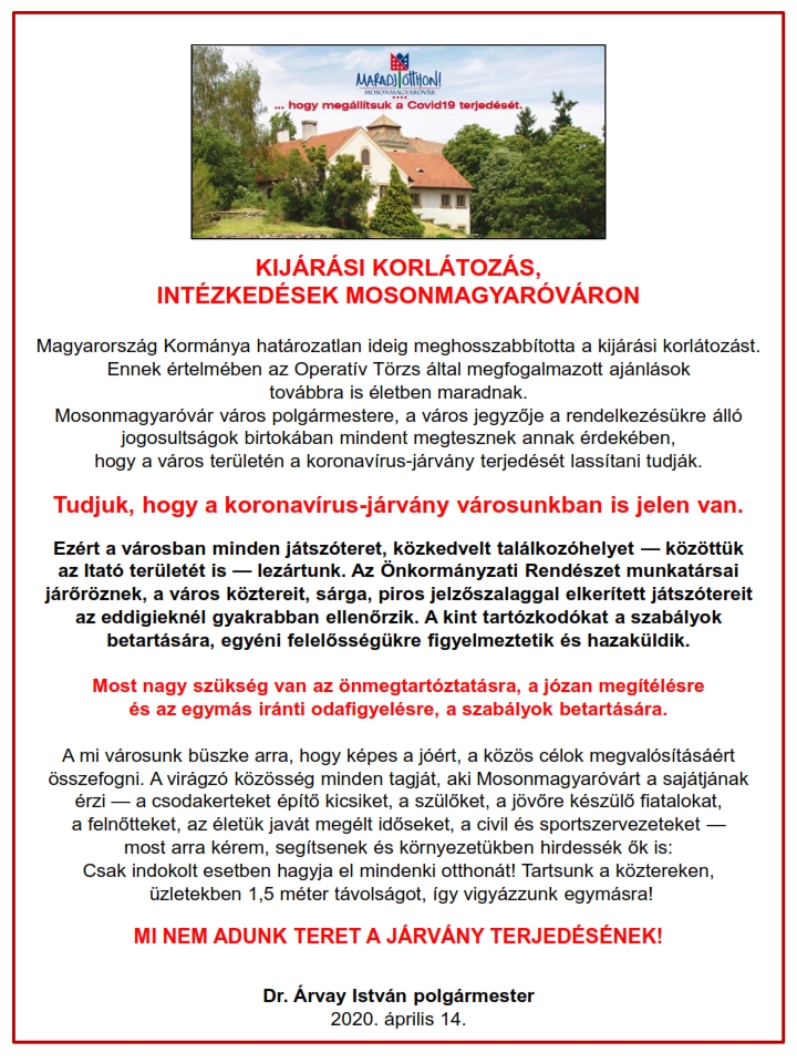 KIJÁRÁSI KORLÁTOZÁS,INTÉZKEDÉSEK MOSONMAGYARÓVÁRONMagyarország Kormánya határozatlan ideig meghosszabbította a kijárási korlátozást.Ennek értelmében az Operatív Törzs által megfogalmazott ajánlások továbbra is életben maradnak.