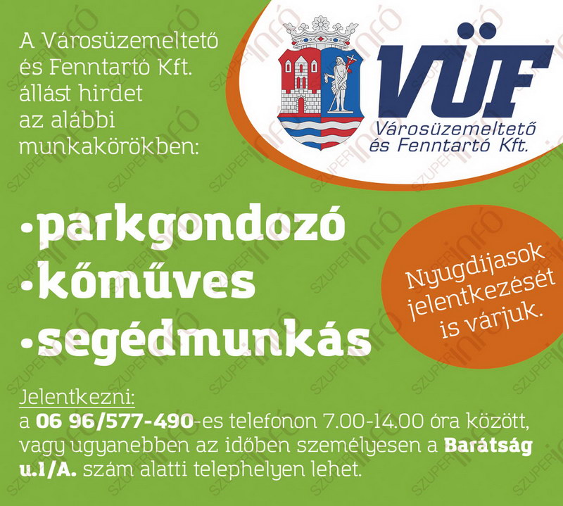 A Városüzemeltető és Fenntartó Kft állást hirdet az alábbi munkaköröben: