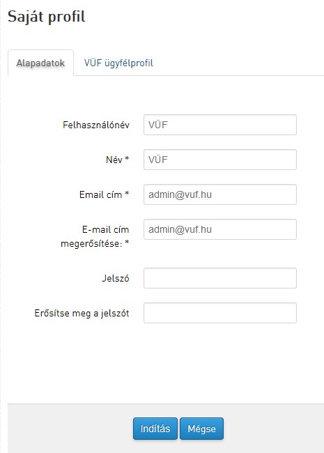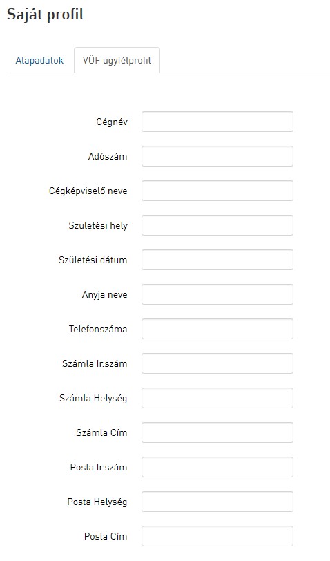A VÜF ügyfélprofil adatok kitöltése, megadása nem kötelező, de a részvételi kérelmek kitöltését segíti, ha ezeket az adatokat kitölti.
