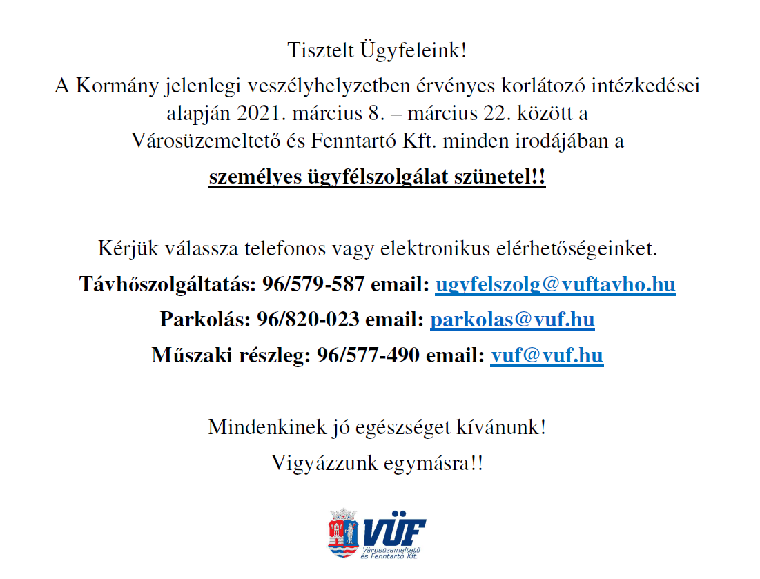 Városüzemeltető és Fenntartó Kft. minden irodájában aszemélyes ügyfélszolgálat szünetel!