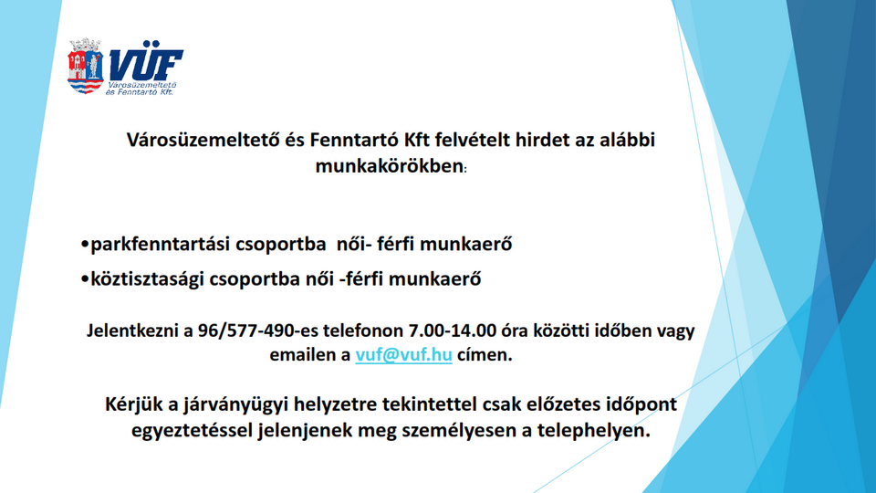 A Városüzemeltető és Fenntartó Kft. (9200 Mosonmagyaróvár, Szent István király út 25.) pályázatot ír ki a